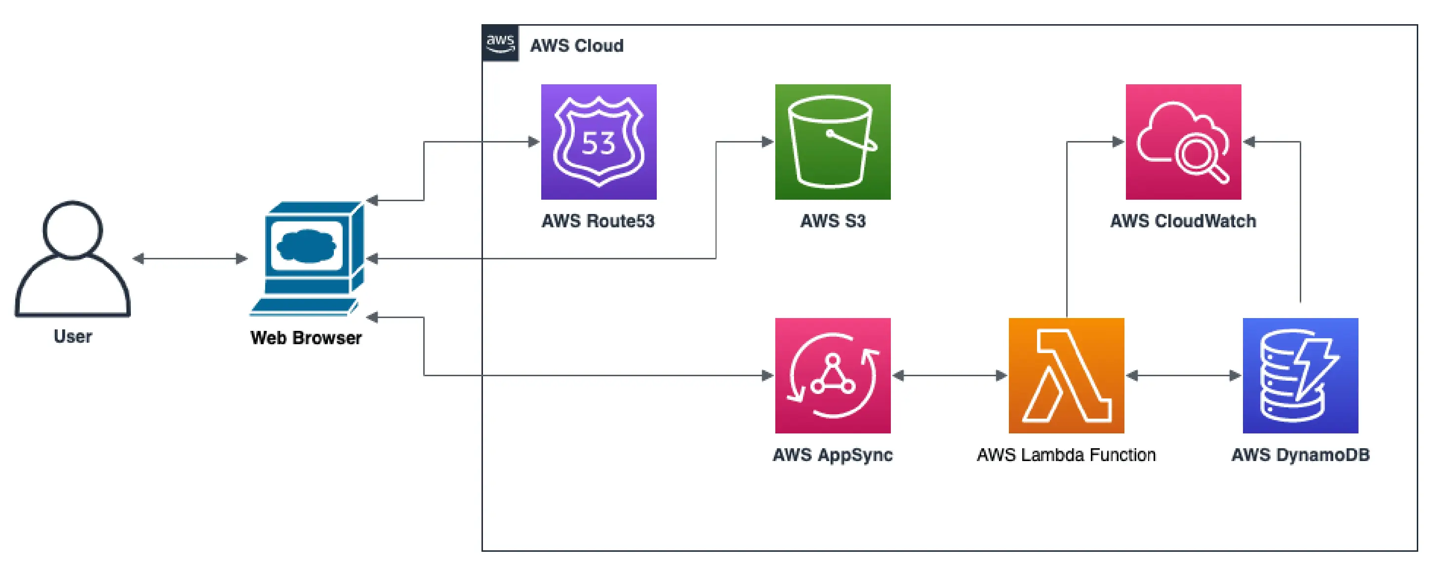 The proposed back-end architecture is very simple thanks to the usage of Serverless computing. User’s Web browser contacts the AWS Route53 DNS service to resolve the domain address. Once resolved, the browser requests static files from an AWS S3 bucket. Afterward, the web browser sends requests to the GraphQL API managed by AWS AppSync, which in turn forwards the requests to AWS Lambda Functions for processing. Lambda Functions fetch data from the AWS DynamoDB, aggregate it, and return it to the client while logging the entire process using AWS CloudWatch.