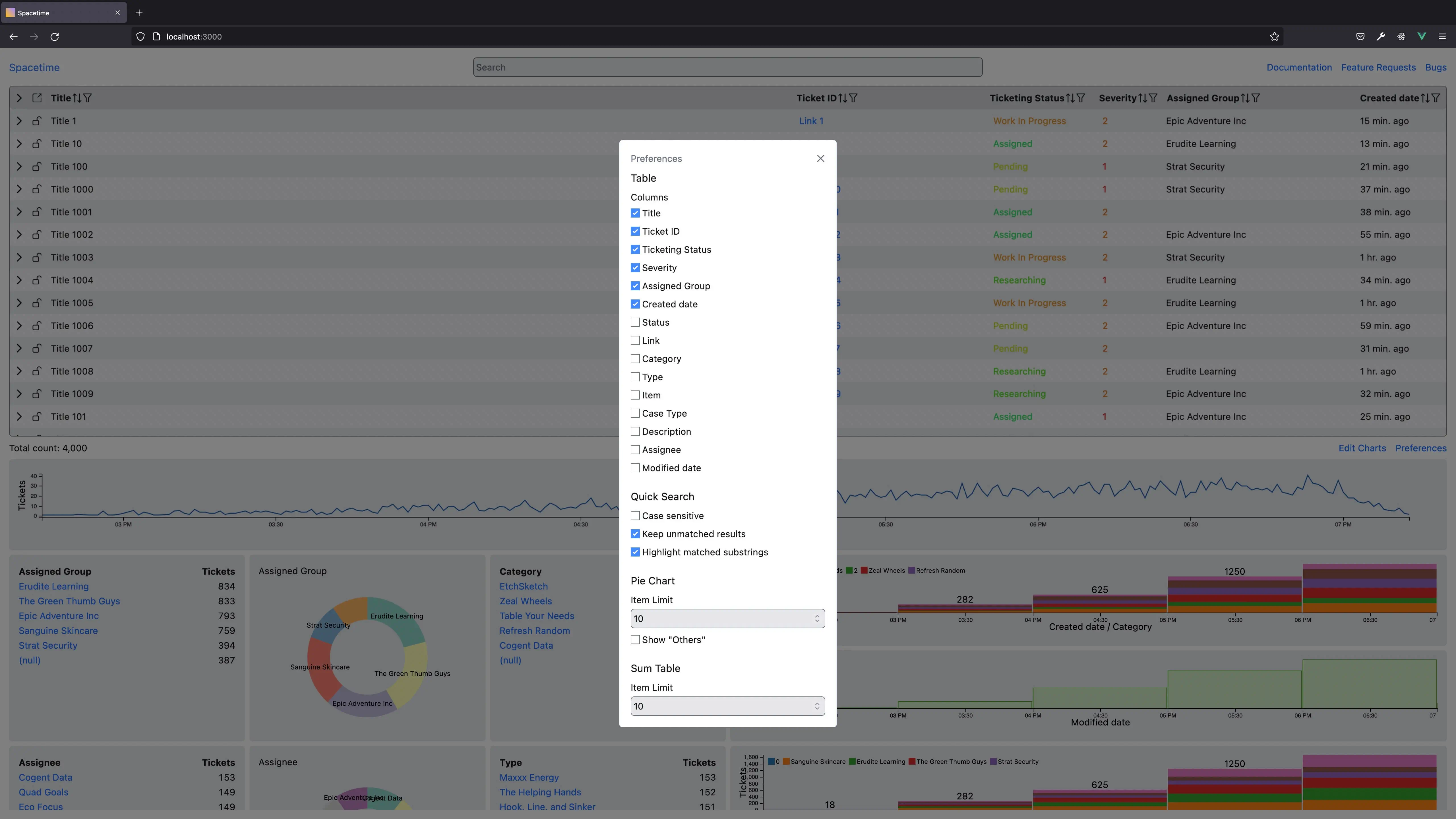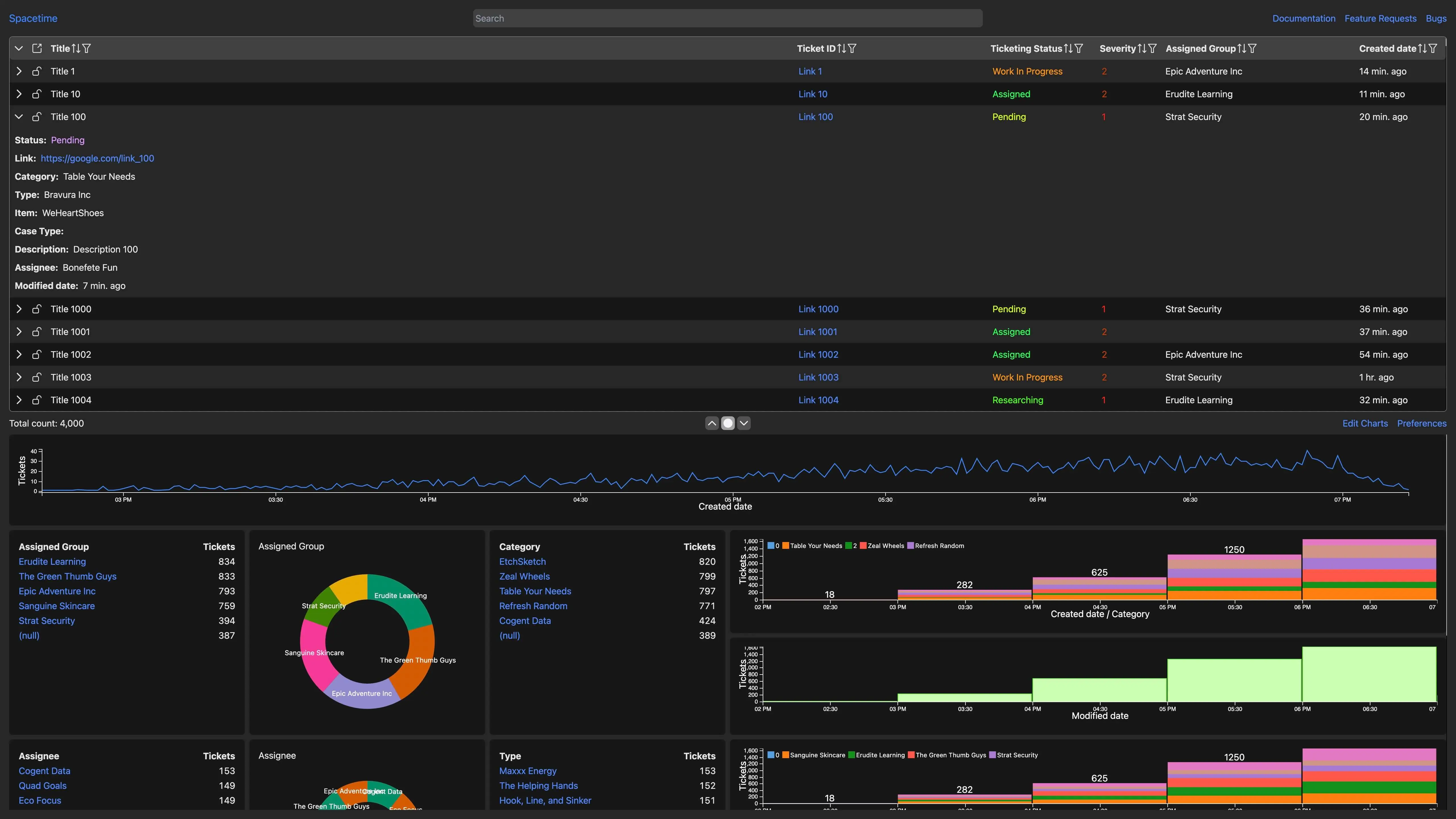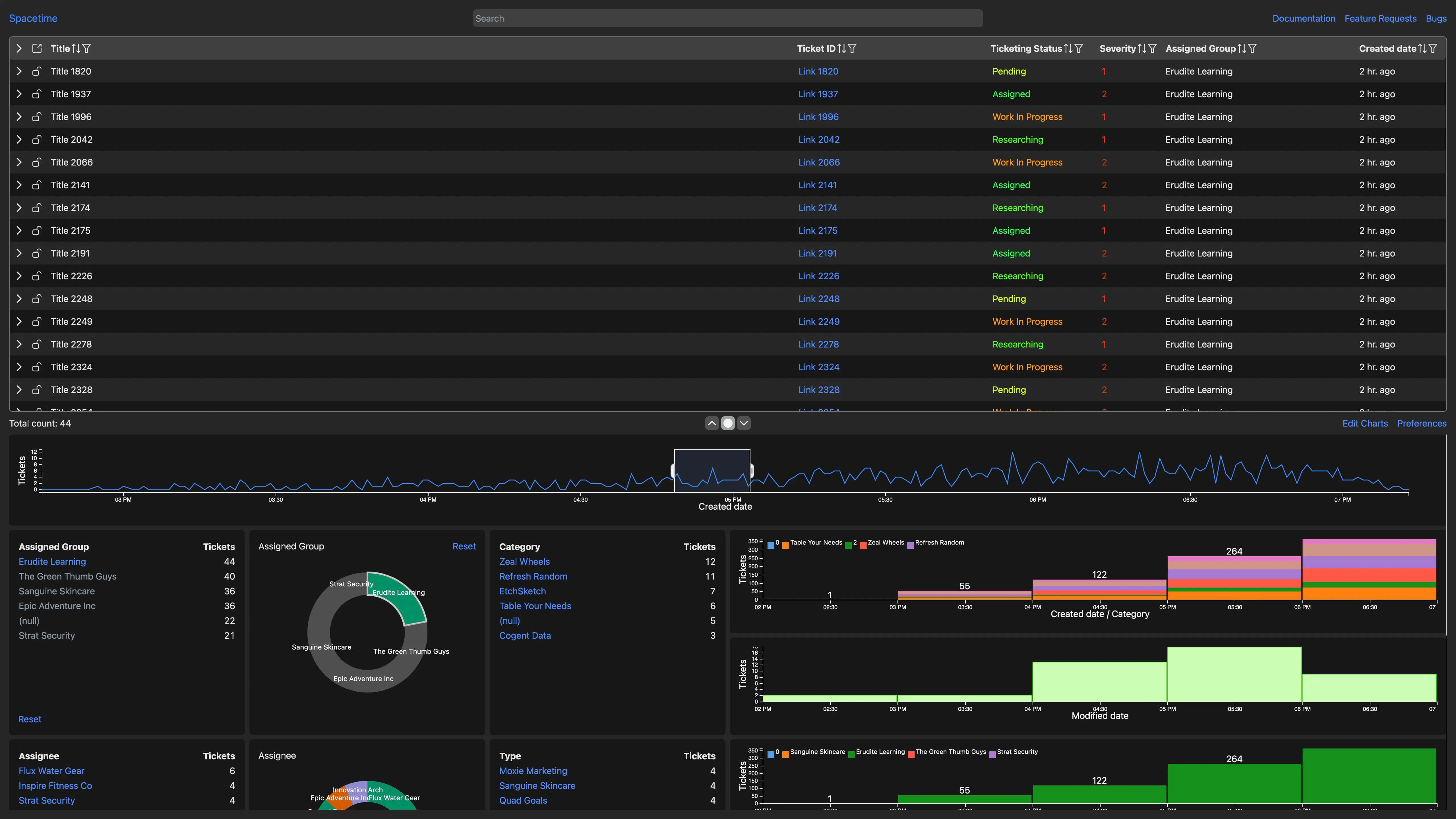 Additionally, since Spacetime is meant to feel very responsive, it downloads all tickets for a selected date range from the backend and does the rest of the filtering on the front-end in response to any filter changes you make. This allows charts to update as soon as you changed a filter, rather than having to wait for a network request to complete.