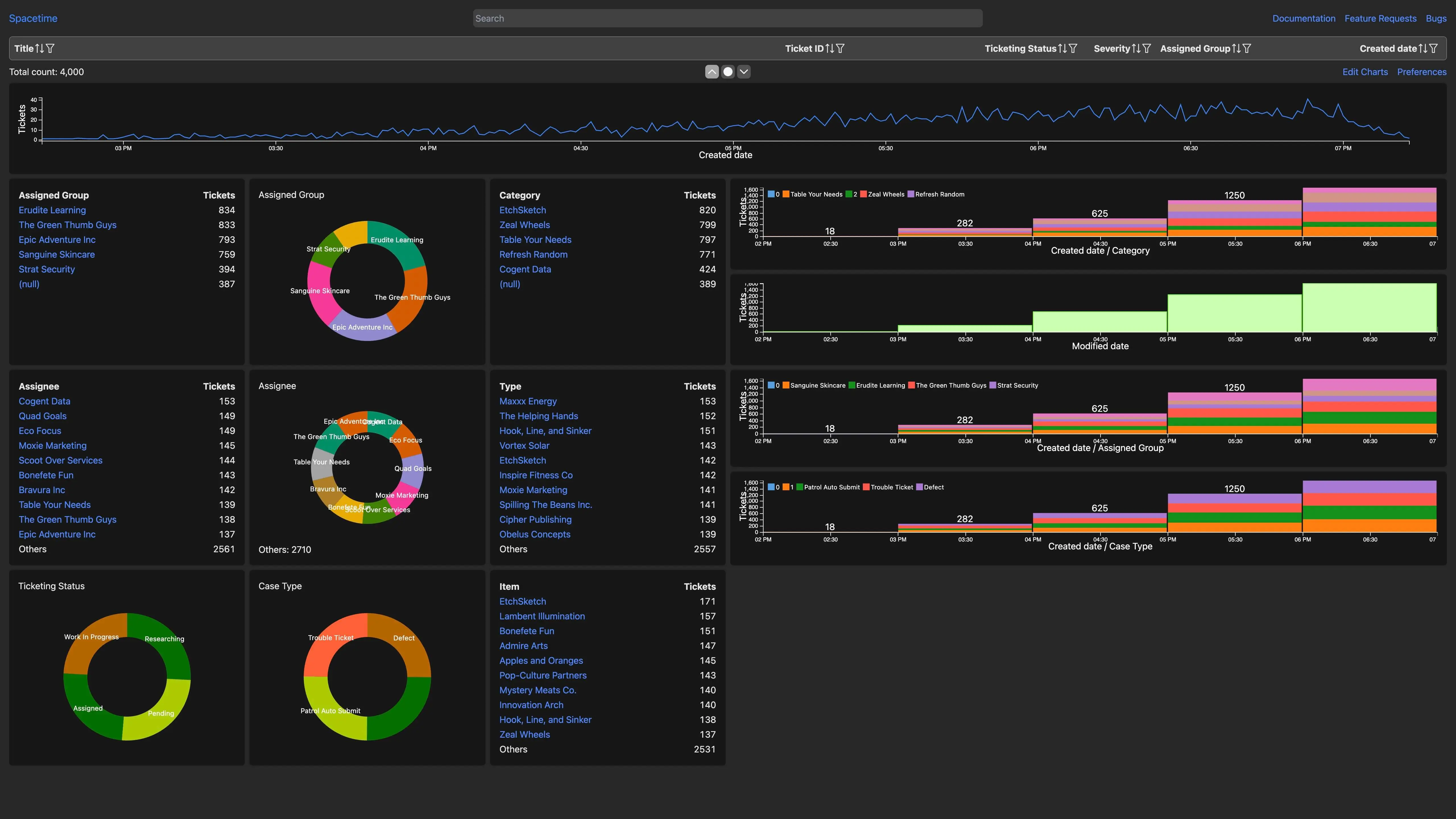 For example, the first chart counts the number of tickets opened at any point. The greatest benefit of plotting data like that is that even without knowing anything about the data, any anomaly would be strikingly visible as a large spike on a line.
